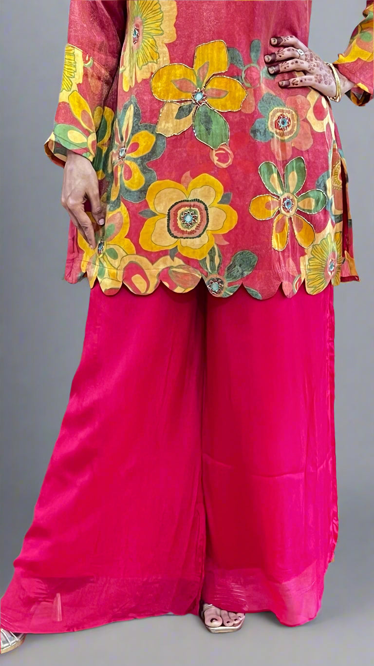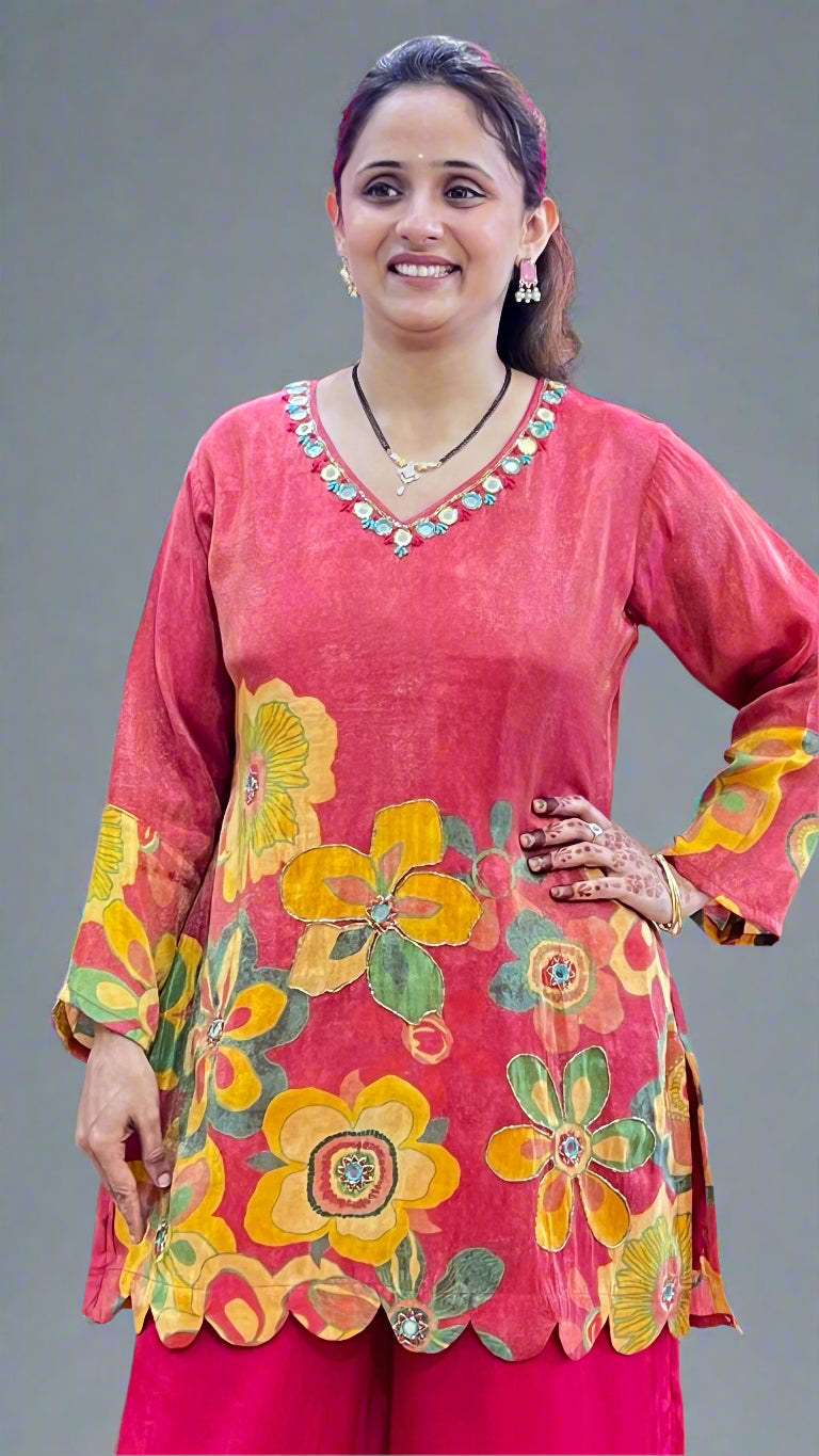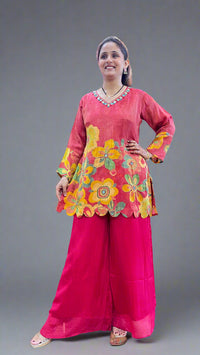 Crafted from premium fabrics ideal for the festive season, this kurta features exquisite handwork on its intricate prints. It comes with pure chinnon q-lot, ensuring both elegance and comfort. Perfect for those seeking sophisticated traditional wear with a refined touch.