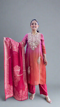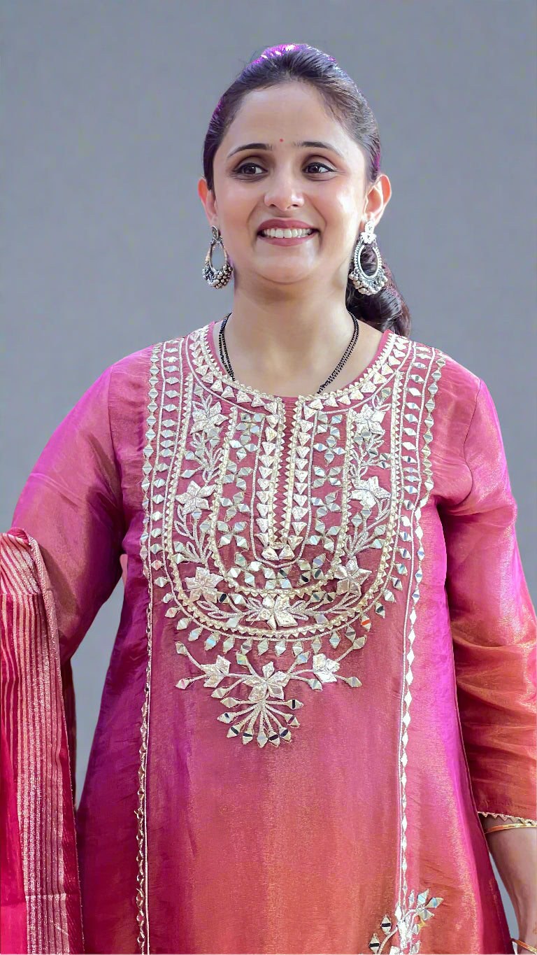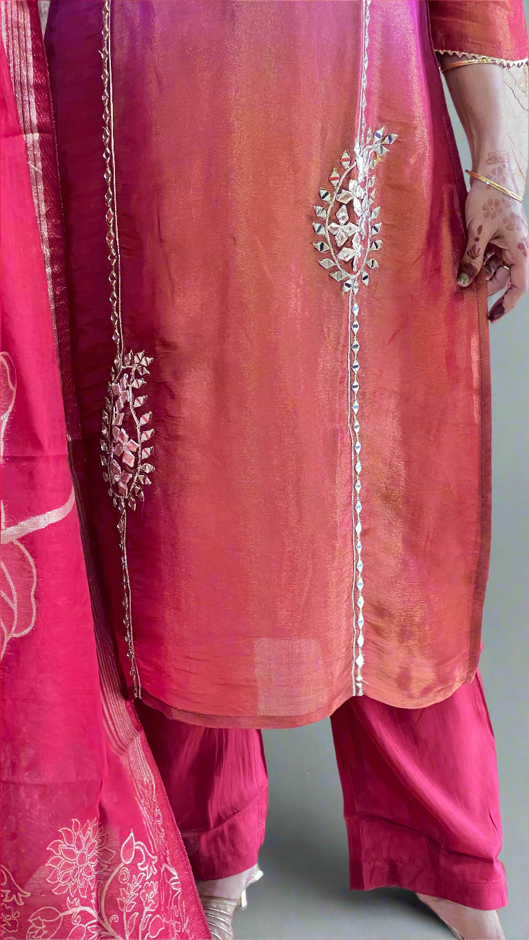 This Gotta Patti work suit in shimmer tissue fabric showcases intricate embroidery in a rich teal shade, perfect for sophisticated occasions. Its delicate embellishments elevate the elegance, while the light, breathable material ensures comfort during extended wear. Ideal for those seeking a refined and graceful ensemble with traditional craftsmanship.