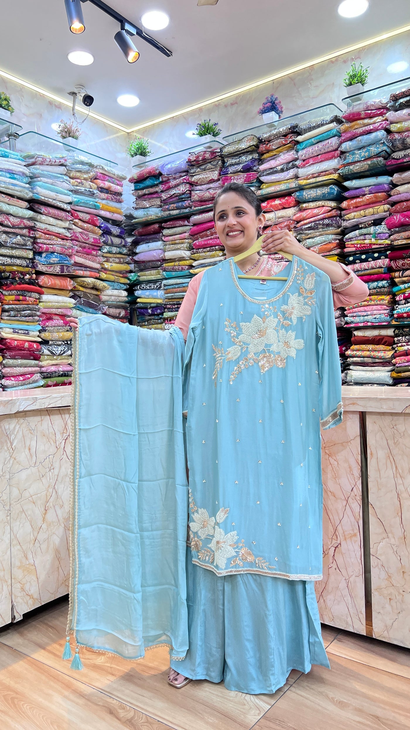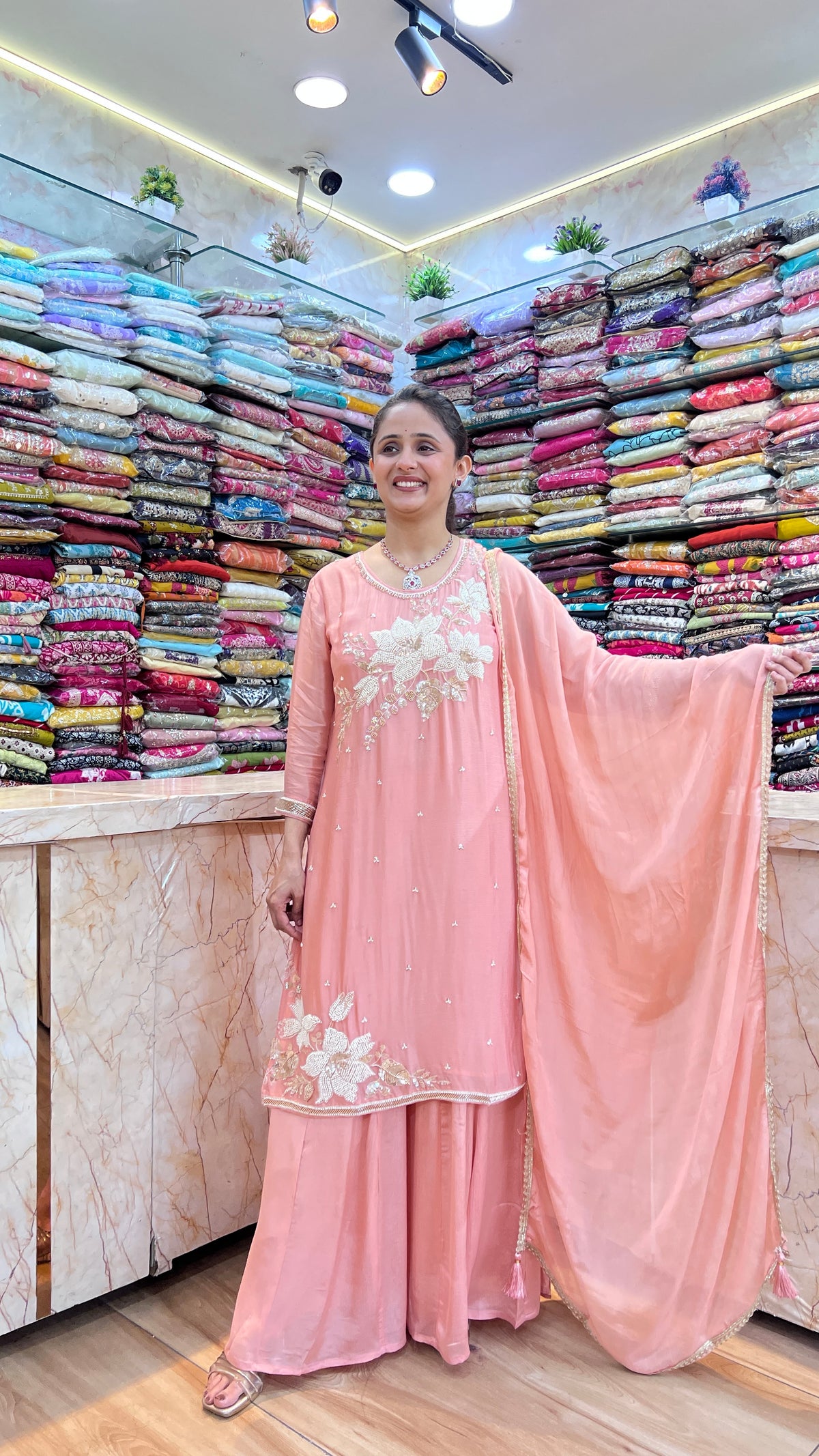 Elevate your professional wardrobe with this sophisticated Chinon pearl work suit. Crafted from premium Chinon fabric, this ensemble combines refined elegance with practical comfort for the modern professional. The delicate pearl work detailing adds a touch of understated luxury, making it ideal for office settings, formal meetings, and special occasions. The structured silhouette ensures a polished appearance while maintaining ease of movement throughout your day. Perfect for those who appreciate quality craftsmanship and timeless style. Model: YM 57367.