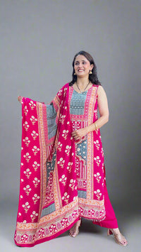This Designer Pure Crape Suit features an elegant kurta with exquisite print and detailed craftsmanship. Sleeves are provided separately and can be attached according to your preference, offering versatility in styling. Crafted from high-quality crape fabric, this suit combines comfort with sophistication, making it ideal for both casual and formal occasions.