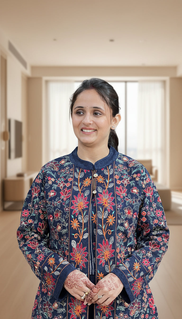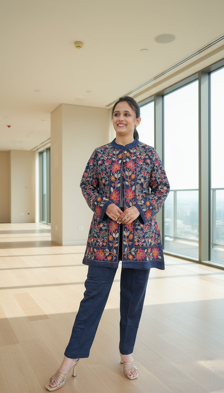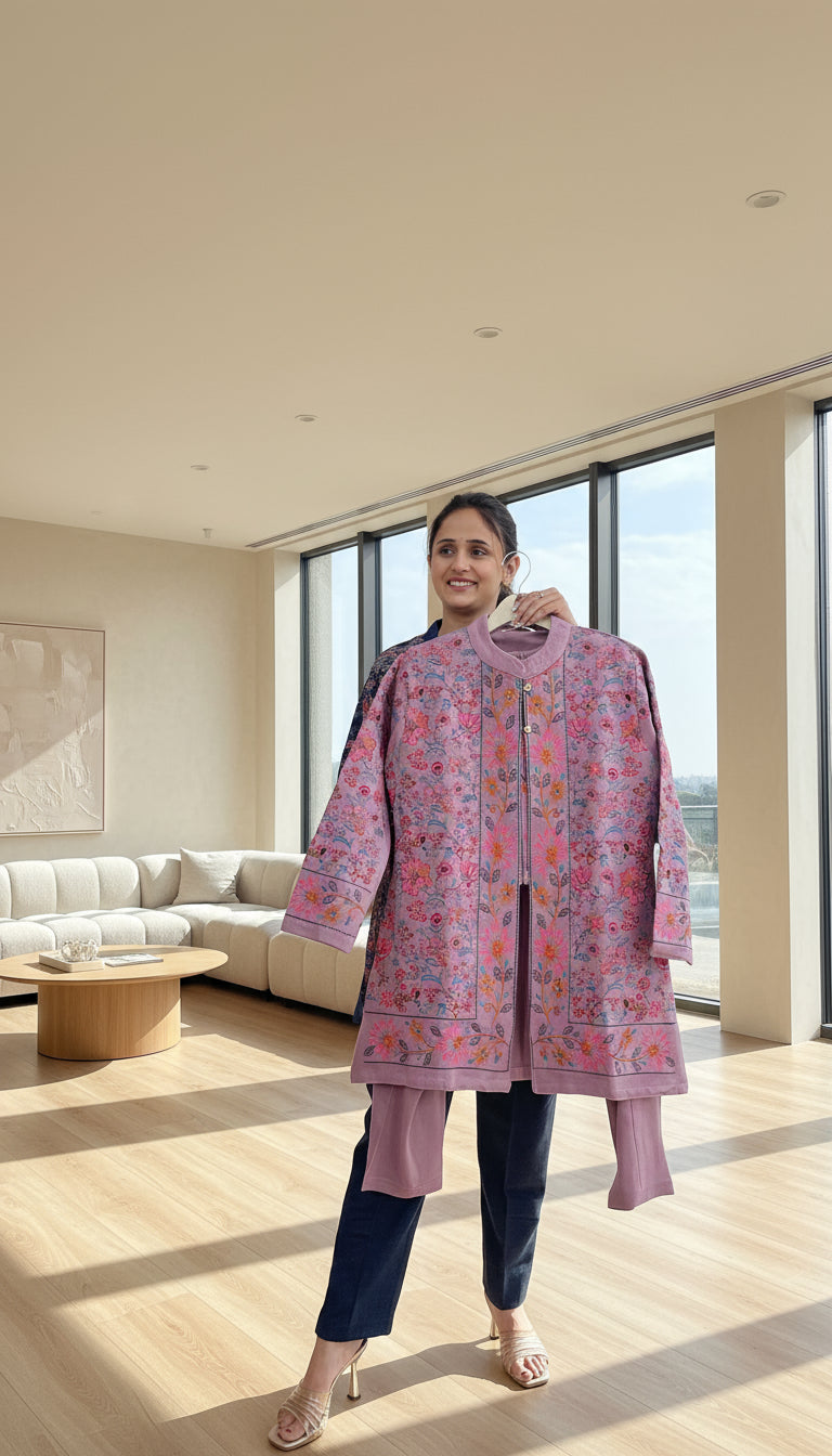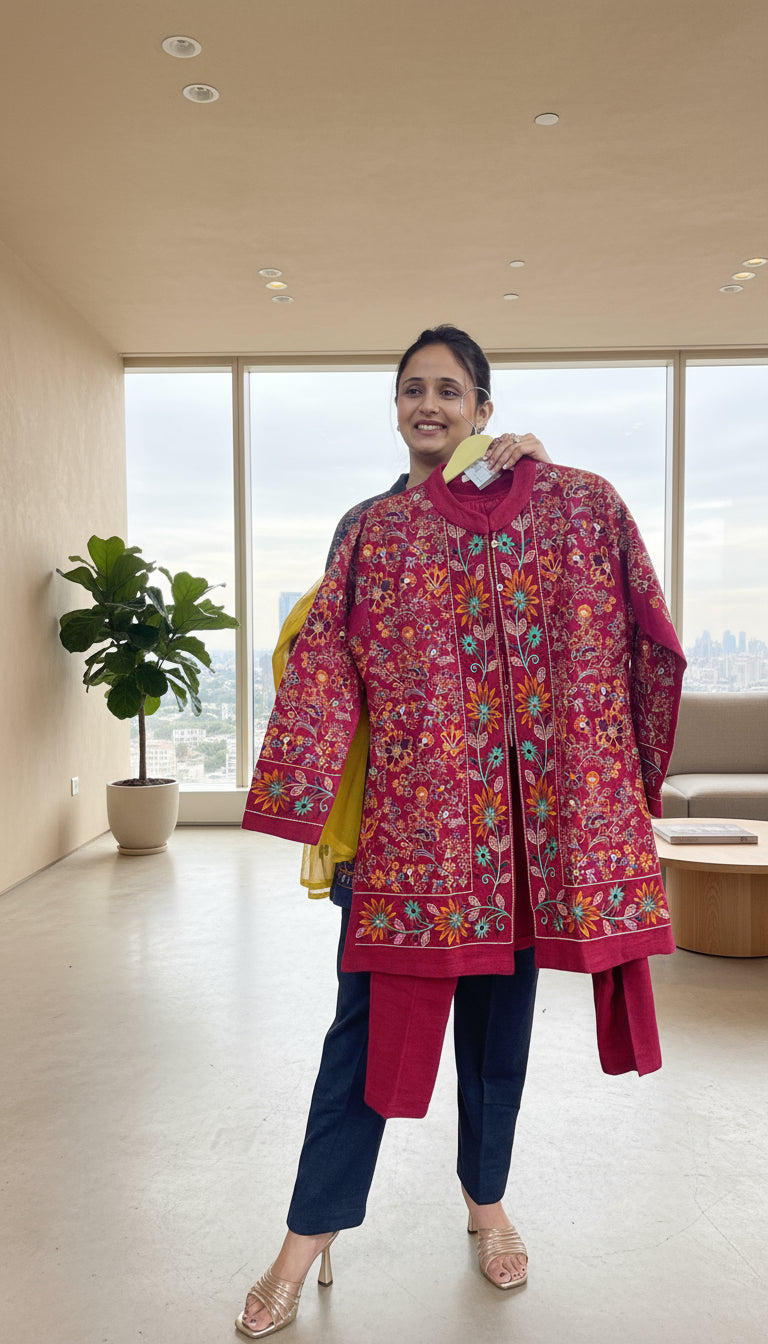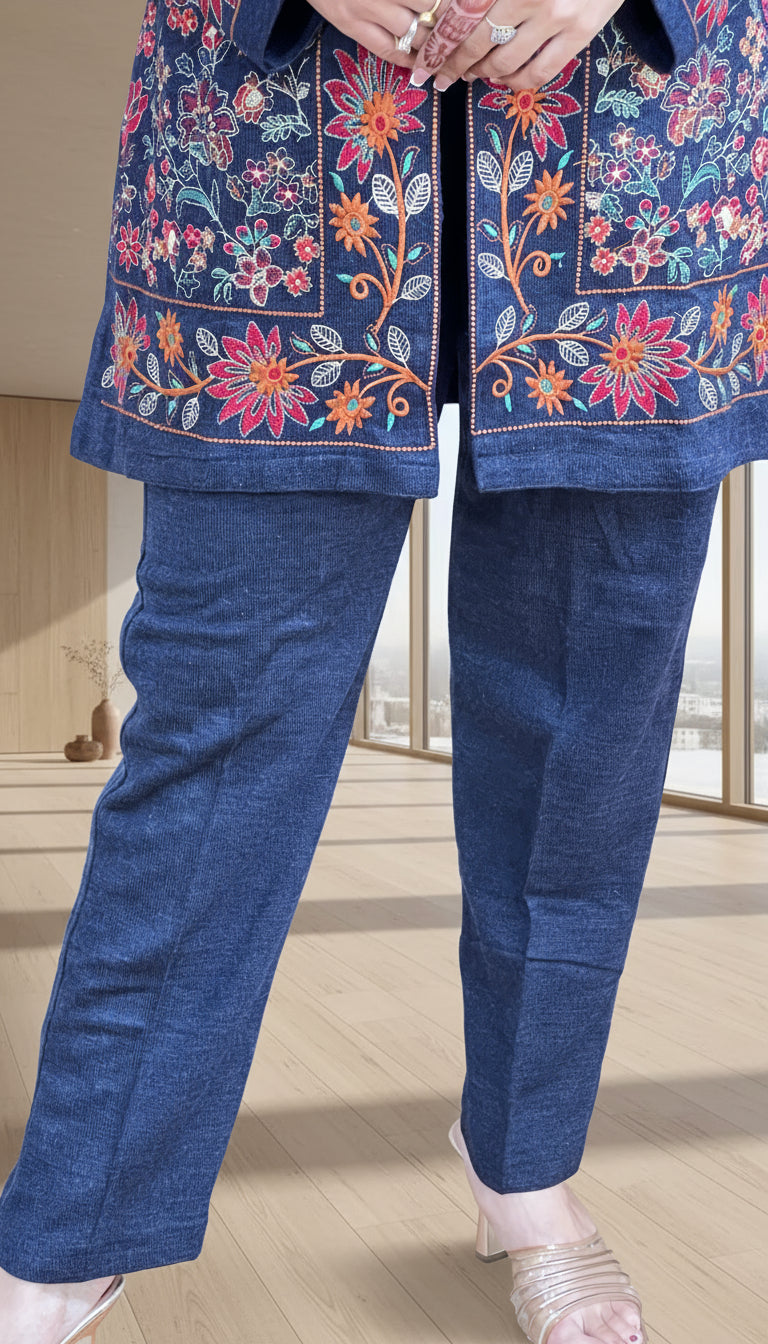 This embroidered woolen cord set features three carefully crafted pieces: a stylish shrug, a soft inner layer, and coordinated pants. Made from warm wool, it offers both insulation and refined style, making it ideal for cooler weather. The embroidery adds a sophisticated touch, while expert tailoring ensures a comfortable fit, perfect for those who appreciate elegance combined with practicality.