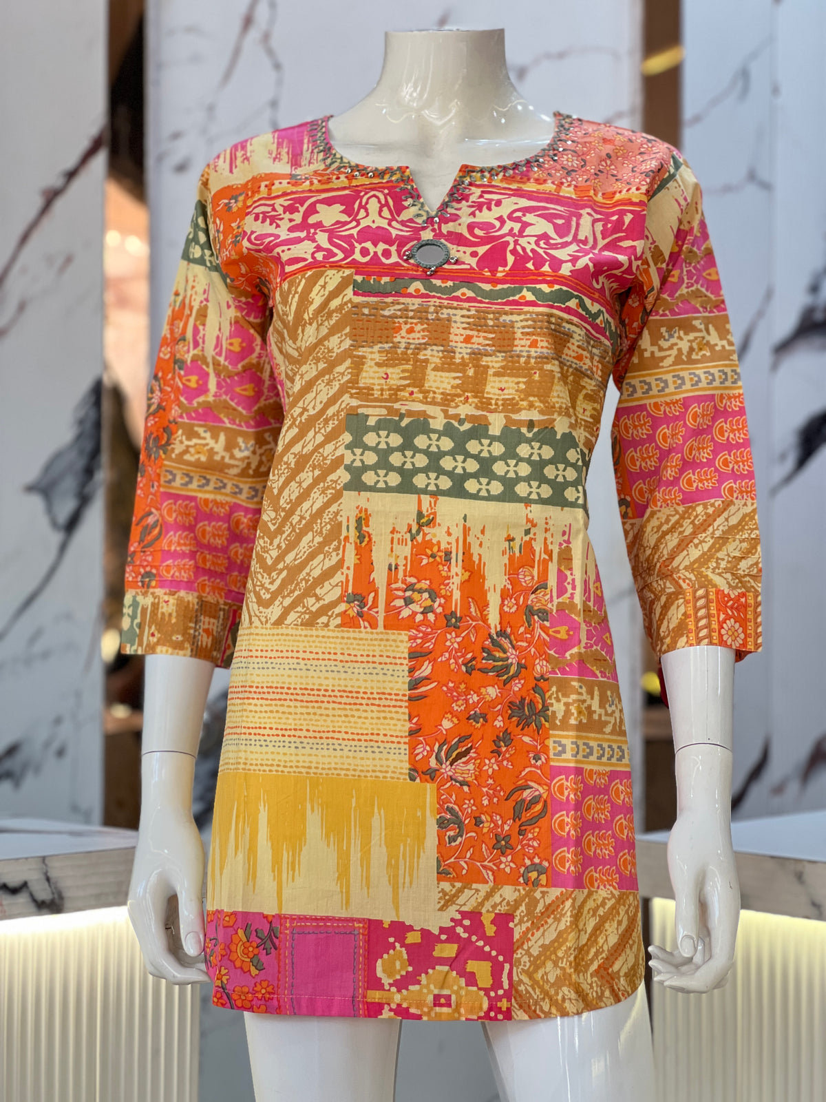 Embrace effortless elegance with this pure cotton short kurti, crafted for comfort and style. The breathable fabric keeps you cool throughout the day, making it perfect for casual outings, work, or relaxed gatherings. Its versatile design pairs beautifully with jeans, leggings, or traditional bottoms, giving you endless styling options. Ideal for the modern Indian woman who values quality and comfort without compromising on grace.