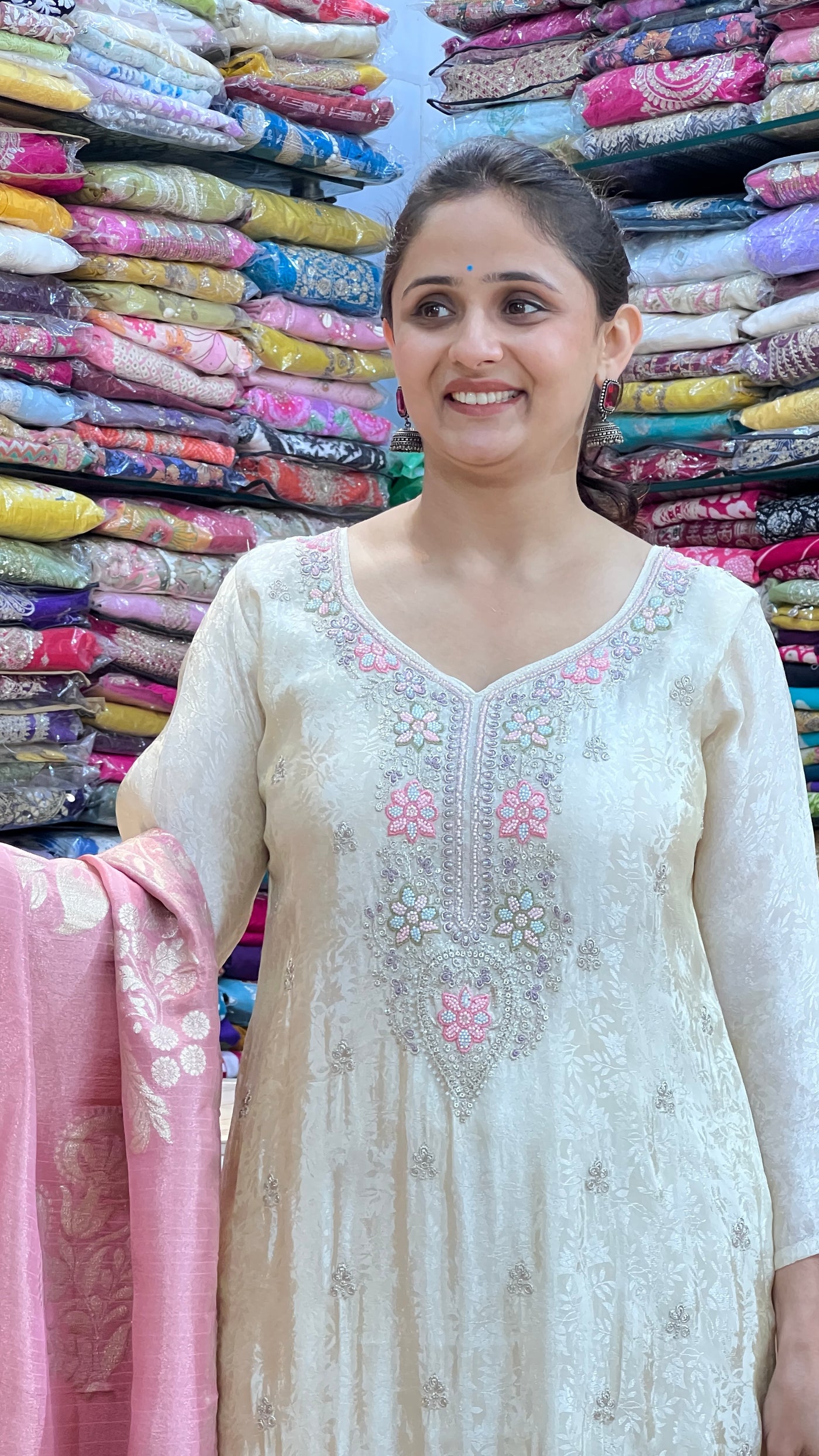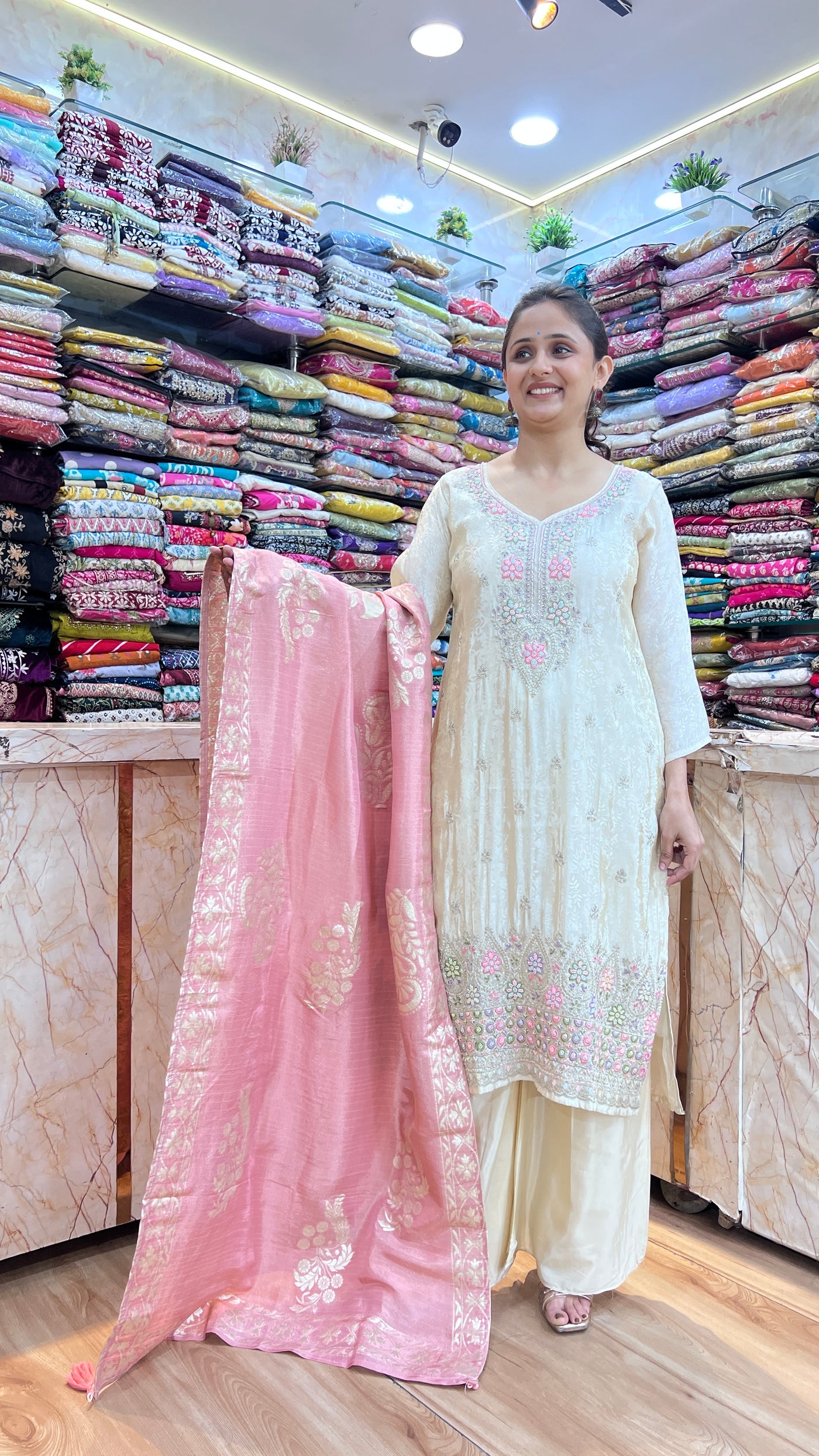Pure jacquard tissue hand work suit crafted with meticulous attention to detail. This elegant ensemble features intricate hand embroidery on premium jacquard tissue fabric, known for its subtle sheen and refined texture. The sophisticated design combines traditional craftsmanship with contemporary styling, making it ideal for festive occasions, celebrations, and formal gatherings. The lightweight tissue construction ensures comfort throughout wear, while the detailed hand work elevates the overall aesthetic. Perfect for those seeking timeless elegance with artisanal quality.